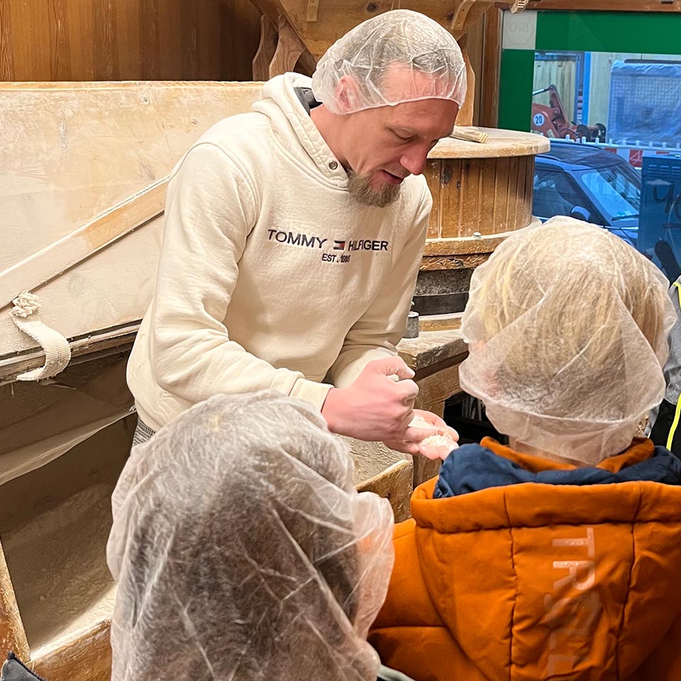 Als erste Station zeigte uns der Bäcker Philipp die Getreidemühlen. Doch bevor wir die Mühlen, Mehlvorräte und Backstube mit den Öfen aus der Nähe betrachten konnten, bekam jeder von uns ein Haarnetz aufgesetzt damit kein Haar ins Mehl gelangte.