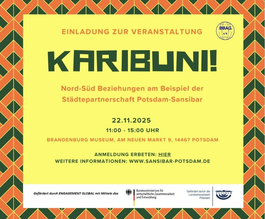 Wer sich ein Bild machen möchte, was ansonsten so läuft im Rahmen der Städtepartnerschaft Potsdam-Sansibar ist herzlich eingeladen am kommenden Samstag ins Brandenburgmuseum. Von 11.00 bis 15:00 Uhr findet dort eine bunte Veranstaltung statt, siehe Flyer.